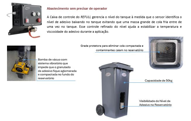 - Aumenta a produtividade (evita parada de produção, por falha na falta de adesivo).